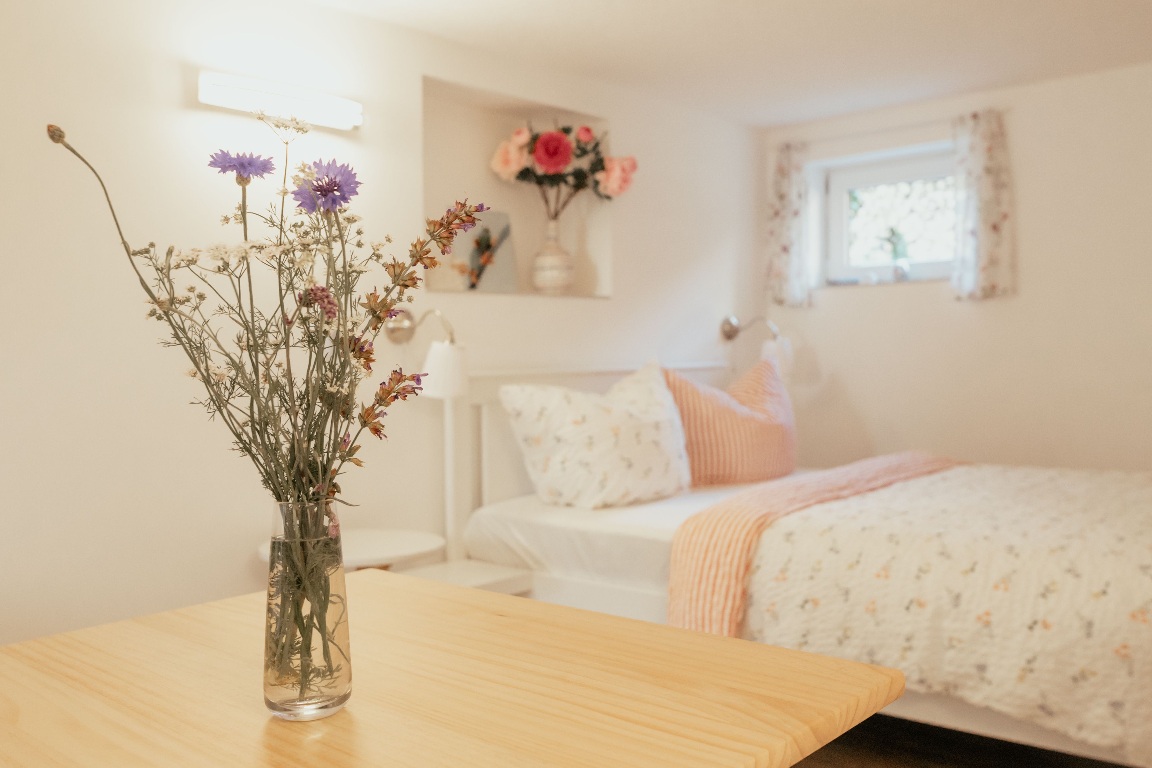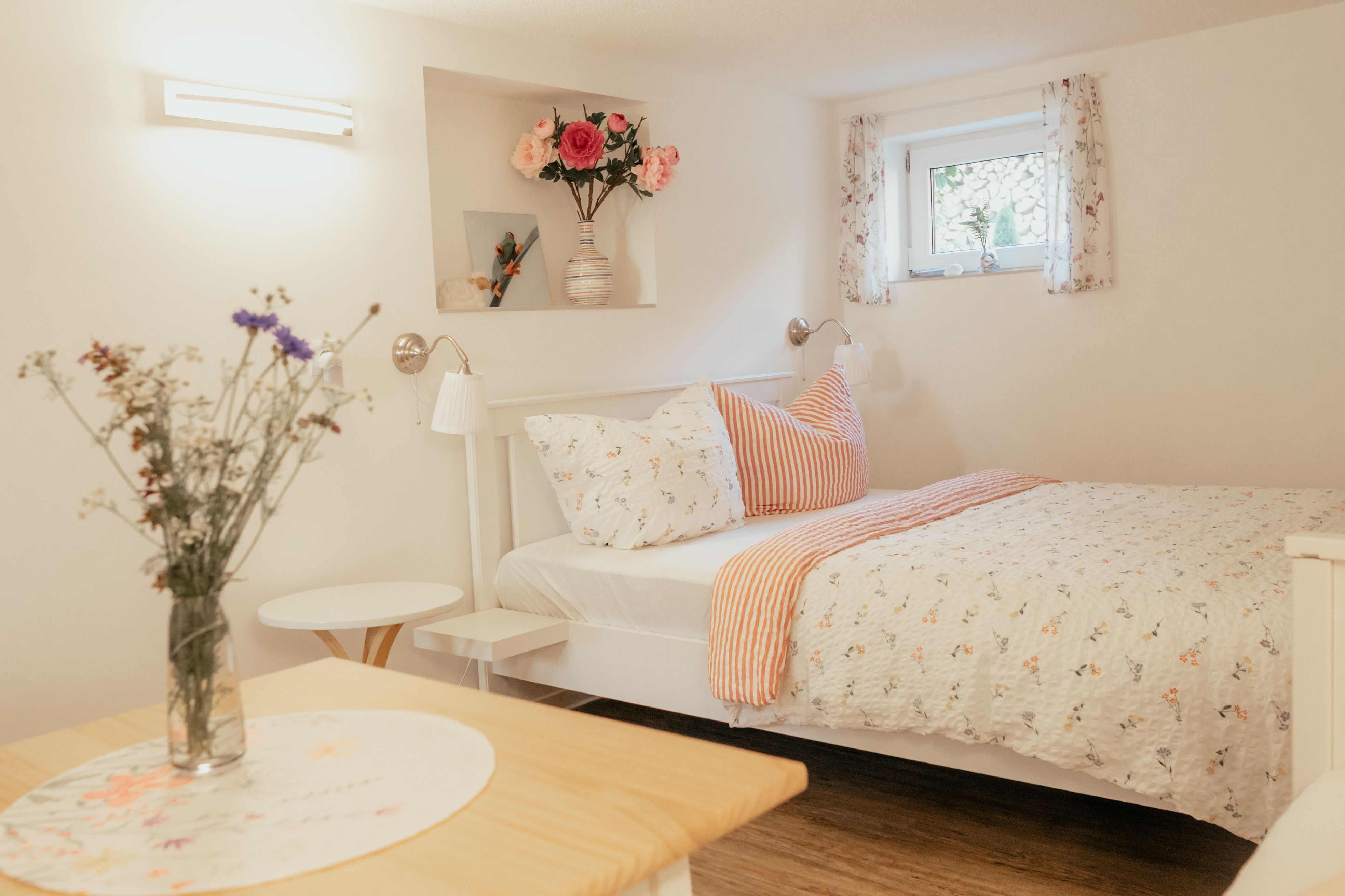 Das charmante Doppelzimmer „Biberbau“ liegt im ruhigen Souterrain und empfängt Sie in angenehmen hellen Tönen, die eine erholsame Atmosphäre schaffen. Besonders in den warmen Monaten bleibt es durch seine Lage im Untergeschoss angenehm kühl und sorgt für erholsamen Schlaf.