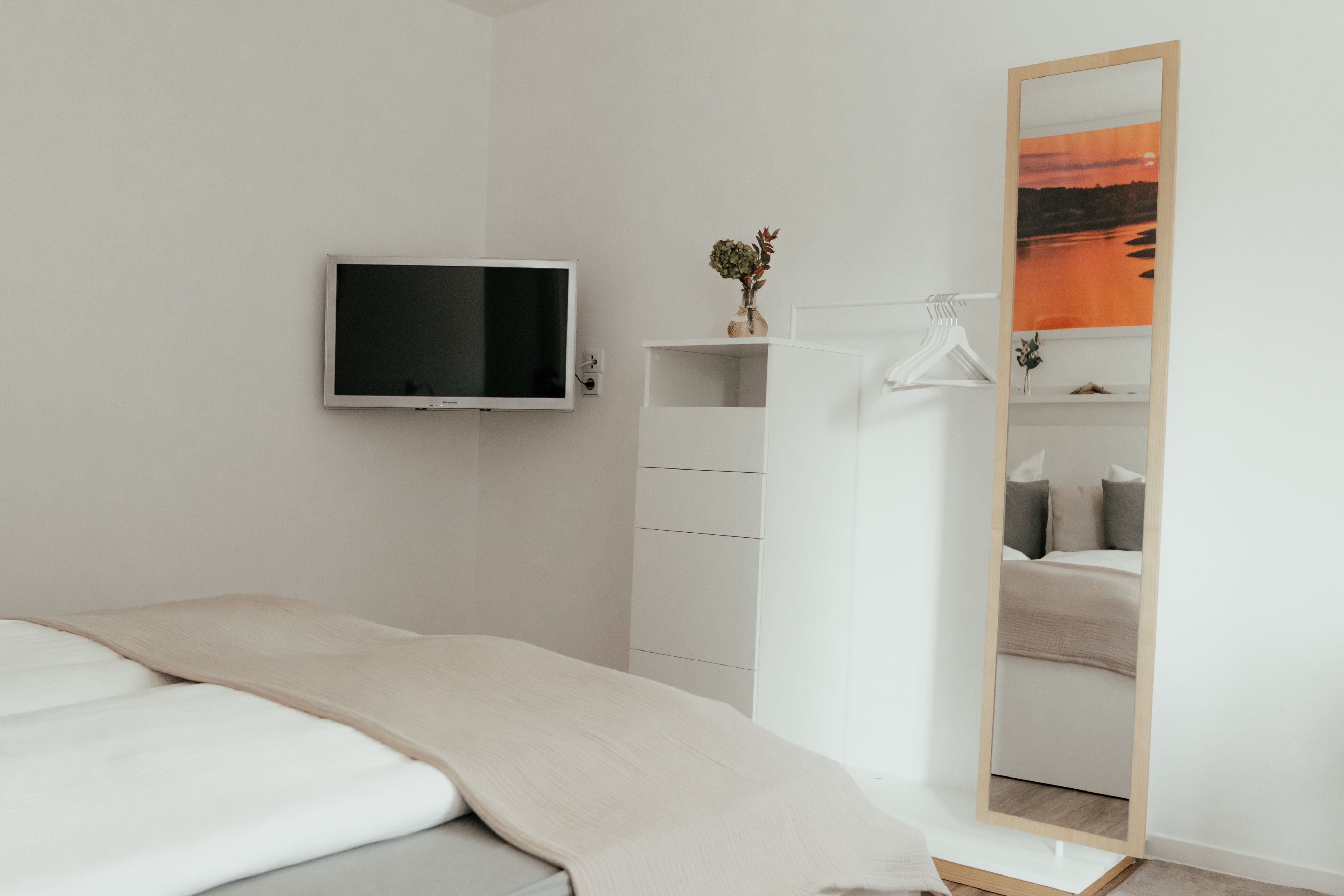 Unser liebevoll eingerichtetes Doppelzimmer „Buhnenglück“ bietet eine helle und ruhige Atmosphäre mit direktem Blick in den Garten. Große Fenster lassen viel Tageslicht herein und schaffen eine freundliche, einladende Stimmung.