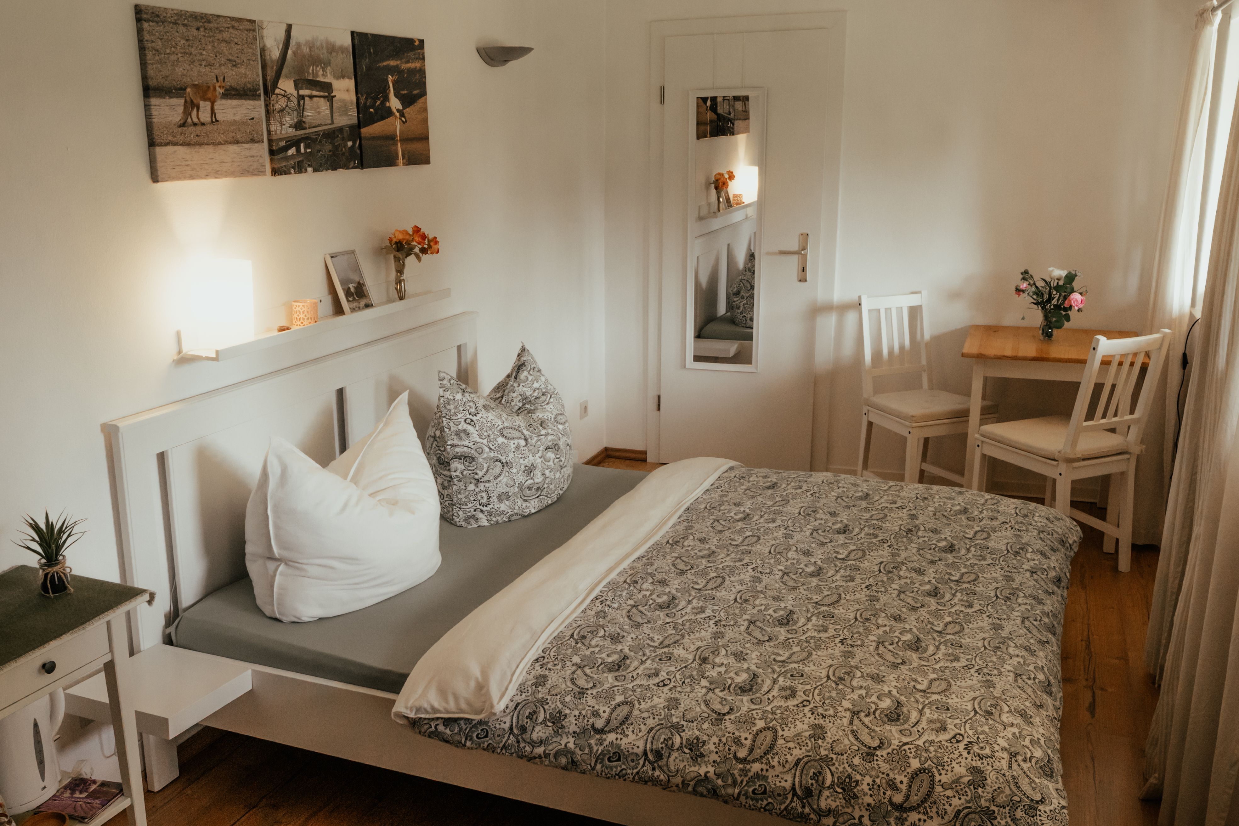 Im Zimmer erwartet Sie ein bequemes Doppelbett für erholsamen Schlaf. Helle Farben, ein großer Lichteinfall durch das Fenster und eine geschmackvolle Einrichtung sorgen für eine freundliche und ruhige Umgebung.